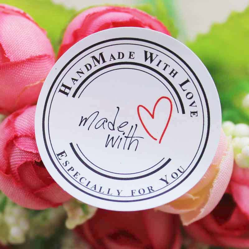 1シート、10個の英語でハンドメイド(Hand made with love)と書かれた白色の丸いのシール販売。