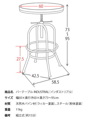 商品名 バーテーブル INDUSTRIAL(インダストリアル) サイズ 幅60×奥行き60×高さ73〜95cm 材質 天然木パイン材(ラッカー塗装)/スチール(粉体塗装) 重量 11kg 備考 組立式(約15分) 配送について ※こちらの商品はメーカー直送の為、代引でのお取扱いができません。